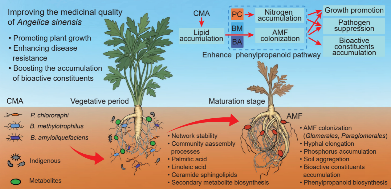 兩項(xiàng)研究分別從激素與苯丙烷代謝調(diào)控以及“功能互補(bǔ)菌群—AMF協(xié)同作用”兩個層面,揭示了微生物介入對當(dāng)歸生長和藥用成分積累的調(diào)控機(jī)制,為“生防菌調(diào)控—宿主響應(yīng)—品質(zhì)形成”提供了重要的實(shí)驗(yàn)依據(jù),并為相關(guān)機(jī)制研究奠定了堅(jiān)實(shí)基礎(chǔ)。