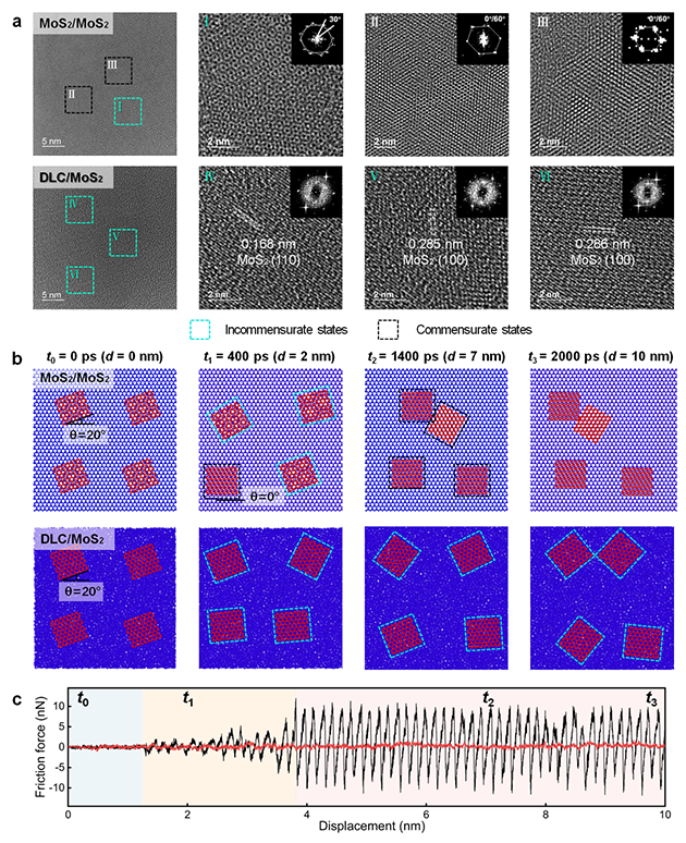 超潤滑工程尺度實現(xiàn)面臨三大核心挑戰(zhàn),即大尺度接觸面的隨機無序性導致超潤滑失控、高接觸壓力下界面形變導致超潤滑失效、大氣環(huán)境活性氣氛引發(fā)界面摩擦化學反應導致超潤滑失穩(wěn)。針對上述挑戰(zhàn),研究團隊從“宏觀接觸-微納界面-分子構型-原子晶格”跨尺度結構進行逐級設計。首先,基于歸一化接觸思想,通過激光織構構建規(guī)則的接觸陣列,將宏觀面接觸歸一化為無數(shù)等同的微米級單元接觸,使每個單元的接觸狀態(tài)(面積、形狀、 受力等)保持一致,這樣界面潤滑材料在同一接觸狀態(tài)下結構變化也趨于一致,整體變得可控(圖1);其次,在每個接觸單元表面構筑剛性非晶類金剛石碳(DLC)膜層/柔性晶體MoS2配副滑移元界面,剛柔結合有力削弱接觸界面在極端高接觸壓力下的形變;進一步采用MXene作為增強與錨定劑,使晶體MoS2在極端高接觸壓力和大氣環(huán)境下保持完整的層狀結構,減少了缺陷與邊緣的不利影響,賦予其抵抗水分子和氧氣氧化能力,從而維持超潤滑界面的穩(wěn)定。最后,揭示了運動過程中原子晶格匹配的動態(tài)偏轉微觀機制(圖2),即非公度態(tài)向公度態(tài)轉化,發(fā)現(xiàn)了非晶DLC/晶體MoS2永久非公度接觸特性,從根本上消除了晶格匹配所導致的原子互鎖。