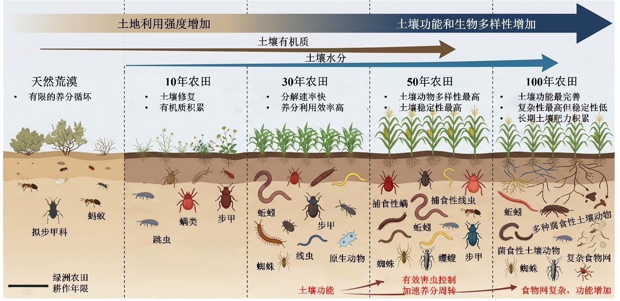 研究發(fā)現(xiàn),與荒漠相比,干旱區(qū)灌溉農(nóng)田的土壤動(dòng)物多樣性大幅提升,土壤動(dòng)物功能也會(huì)隨著年限的增加而增多,但長(zhǎng)期耕作及撂荒均會(huì)對(duì)土壤動(dòng)物多樣性及其功能產(chǎn)生負(fù)面影響,進(jìn)而影響土壤健康與穩(wěn)定。