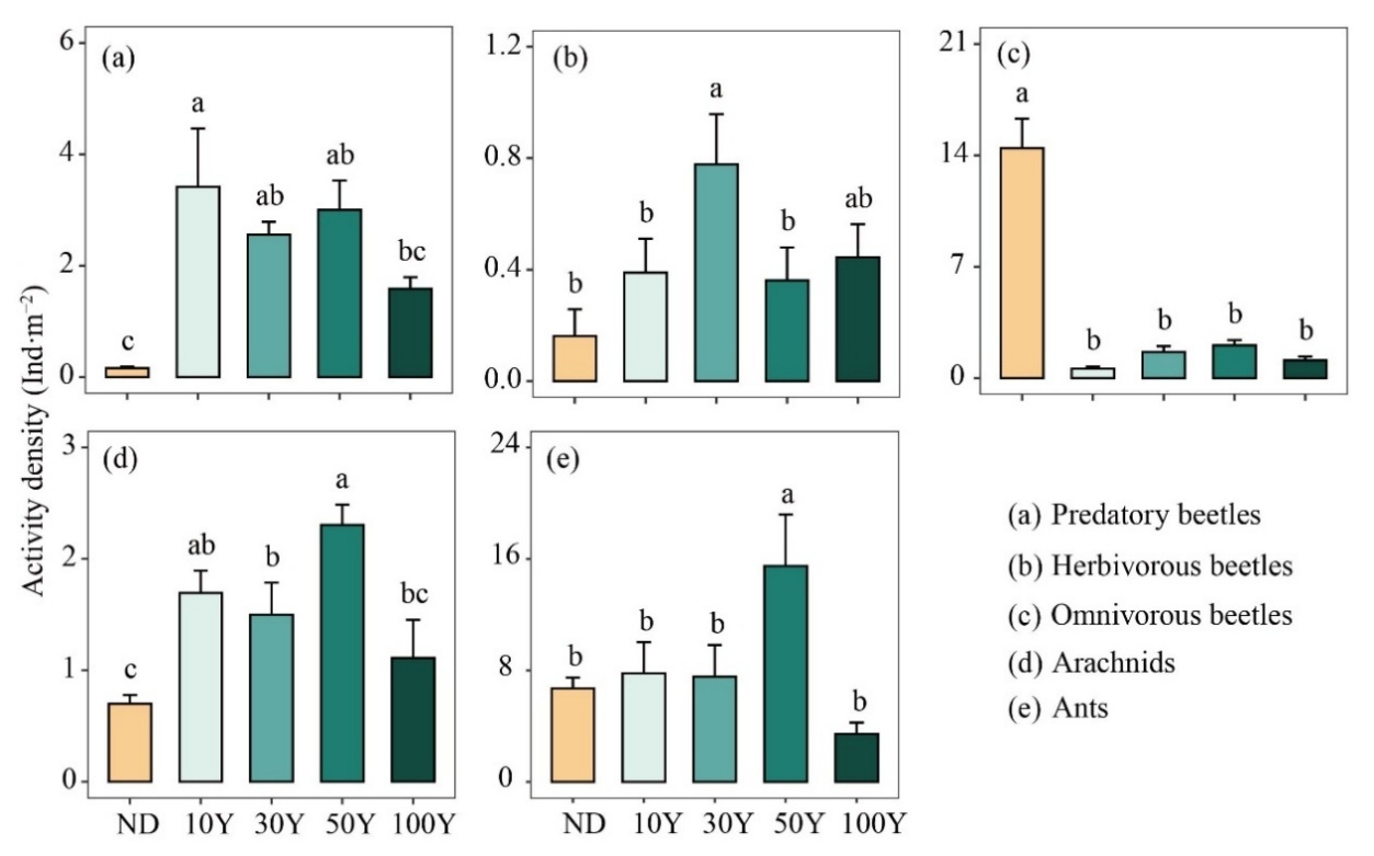 天然荒漠、10年、30年、50年和100年農(nóng)田捕食性甲蟲、植食性甲蟲、雜食性甲蟲、蛛形綱和螞蟻的活動(dòng)密度