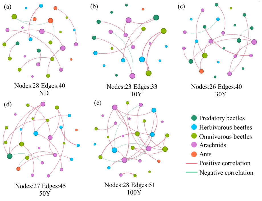 天然荒漠、10年、30年、50年和100年農(nóng)田不同營(yíng)養(yǎng)級(jí)地表節(jié)肢動(dòng)物的共線性網(wǎng)絡(luò)