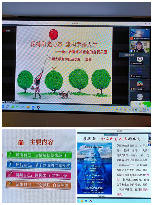 講座特邀蘭州大學哲學社會學院、心理中心兼職督導師彭賢副教授作了題為“保持陽光心態(tài) 建構(gòu)幸福人生——基于薩提亞和正念的自我關愛”的報告。報告圍繞聆聽自己、評估自己、調(diào)頻自己、活出自己四個方面,結(jié)合大量案例解析,介紹了薩提亞和正念的心理調(diào)節(jié)方法和技巧。