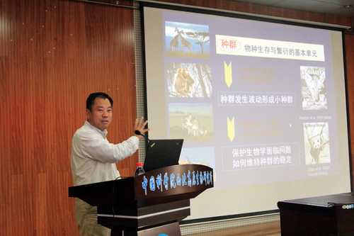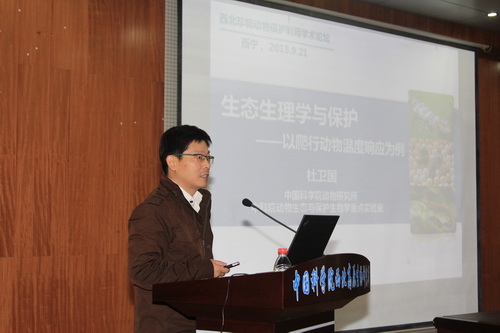 本次論壇共安排11個(gè)特邀報(bào)告。中國(guó)科學(xué)院院士、中國(guó)科學(xué)院水生生物研究所研究員桂建芳,中國(guó)科學(xué)院動(dòng)物研究所研究員蔣志剛、王德華、雷富民、杜衛(wèi)國(guó)、詹祥江,西北大學(xué)教授李保國(guó)、中國(guó)科學(xué)院昆明動(dòng)物研究所研究員施鵬、東北林業(yè)大學(xué)教授張明海、山東大學(xué)教授李玉春、西北高原所研究員楊其恩分別作了題為“多倍體銀鯽及其復(fù)合種的生態(tài)分布格局與演化歷史”、“未雨綢繆、亡羊補(bǔ)牢:量化中國(guó)哺乳動(dòng)物滅絕風(fēng)險(xiǎn)”、“生理生態(tài)學(xué)與動(dòng)物保護(hù):學(xué)科地位與發(fā)展的思考”、“應(yīng)對(duì)第四紀(jì)冰期和氣溫變化的鳥類譜系地理學(xué)過程”、“生態(tài)生理學(xué)與保護(hù):以爬行動(dòng)物溫度響應(yīng)為例”、“Reference genome, population genetics and population genomics of wild falcons”、“環(huán)境變化下的秦嶺金絲猴社群結(jié)構(gòu)”、“基因組時(shí)代下的生物多樣性資源挖掘”、“基于糞便分子生物學(xué)及3S技術(shù)的馬鹿家域研究”、“我國(guó)小型哺乳動(dòng)物物種多樣性的低估與保護(hù)迫切性”和“配子體外生產(chǎn)技術(shù)在畜牧生產(chǎn)和野生動(dòng)物保護(hù)中的應(yīng)用潛力和挑戰(zhàn)”的報(bào)告。精彩絕倫的報(bào)告引起了與會(huì)代表的極大興趣,大家認(rèn)真傾聽、踴躍發(fā)言,展開了熱烈的交流與討論,現(xiàn)場(chǎng)氣氛異常活躍。