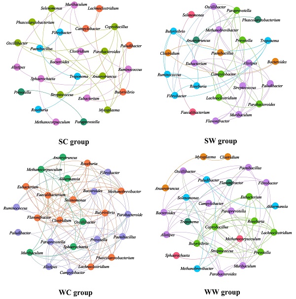 圖2 不同環(huán)境及季節(jié)下藏野驢腸道菌群核心菌群(屬水平)的共生網(wǎng)絡(luò)圖