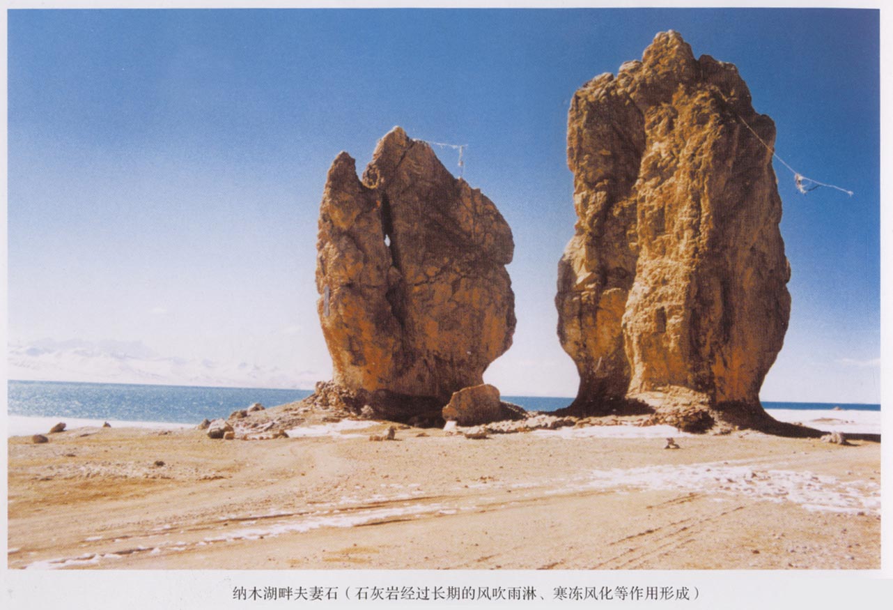 青藏高原石灰?guī)r的分布面積約20萬平方公里,大自然的神工鬼斧雕塑了奇形怪狀的巖溶形態(tài)。位于高原東緣的龍、九寨溝是石灰?guī)r溶蝕和碳酸鈣沉積形成的巖溶景色的代表,在高原腹地的唐古拉山山坡安多山上有巖溶洞、巖溶峰和其它奇形怪狀的巖溶地貌。在西藏昌都附近的大喇嘛山下有一排似長城?樣的峰林墻組合。在阿里地區(qū)的班公湖畔有許多峰林溶洞,是鳥類棲息的最佳天然場所,形成了藍(lán)天、白云、鳥飛、魚躍、湖靜、岸奇的人間仙 境。在青藏公路沿線的雁石坪溫泉一帶也分布著由泉華堆積形成的泉華錐和石灰?guī)r造型。